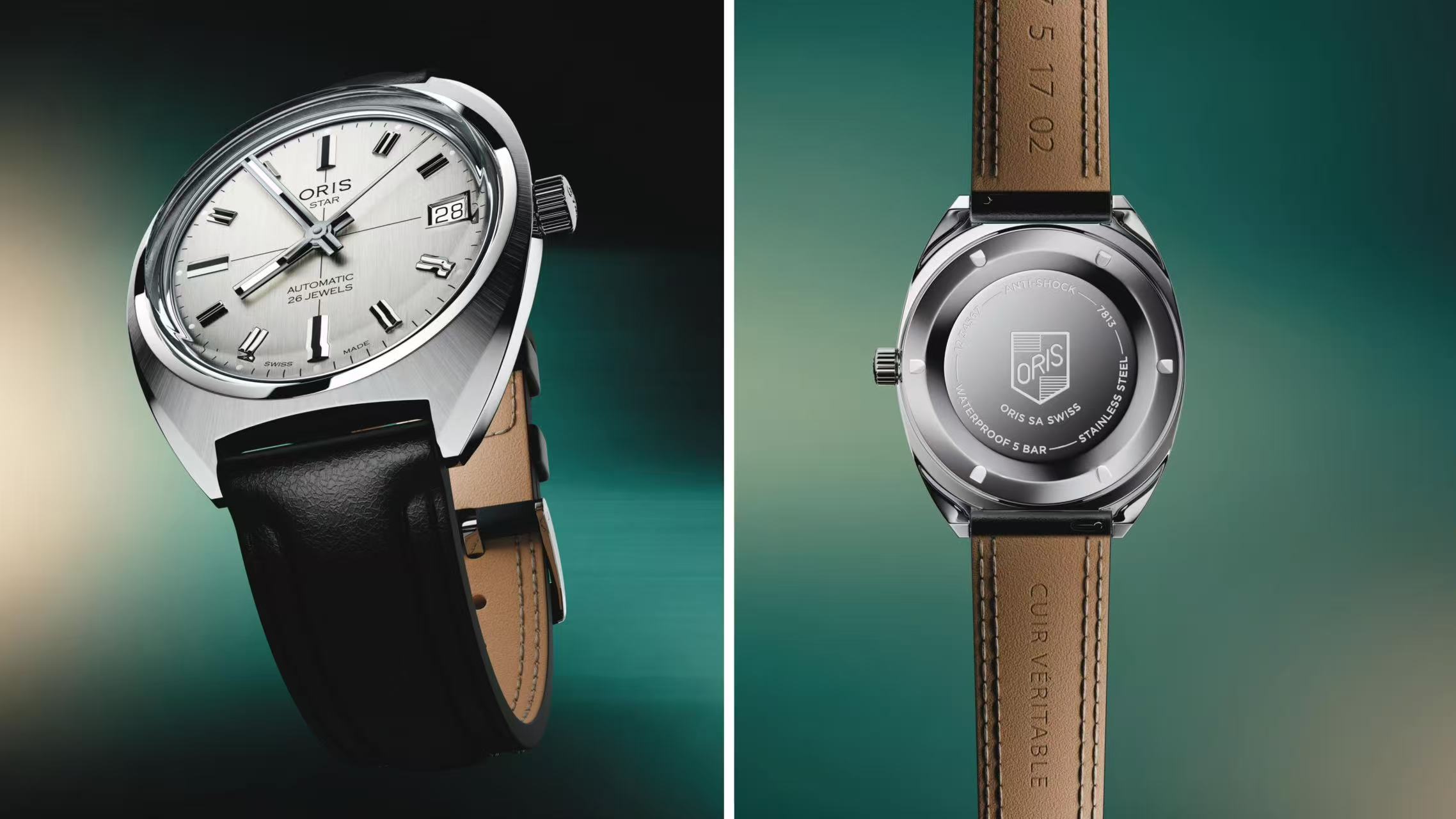 1966年,豪利时推出品牌首款搭载自制杠杆擒纵机芯的腕表——豪利时之星。60载之后,全新豪利时之星诞生,并忠实再现了原作的35毫米酒桶形表壳与一体式表耳。银色表盘饰以简洁的双棒状时标和方形指针,表盘上新增“Star”“Automatic”和“26 Jewels”字样;3点钟位置设有不对称日期显示窗。腕表搭载Oris Calibre 733自动上链机芯,41小时动力储存,28800次/小时振频。表背镌刻上世纪60年代标志性盾形徽章。
