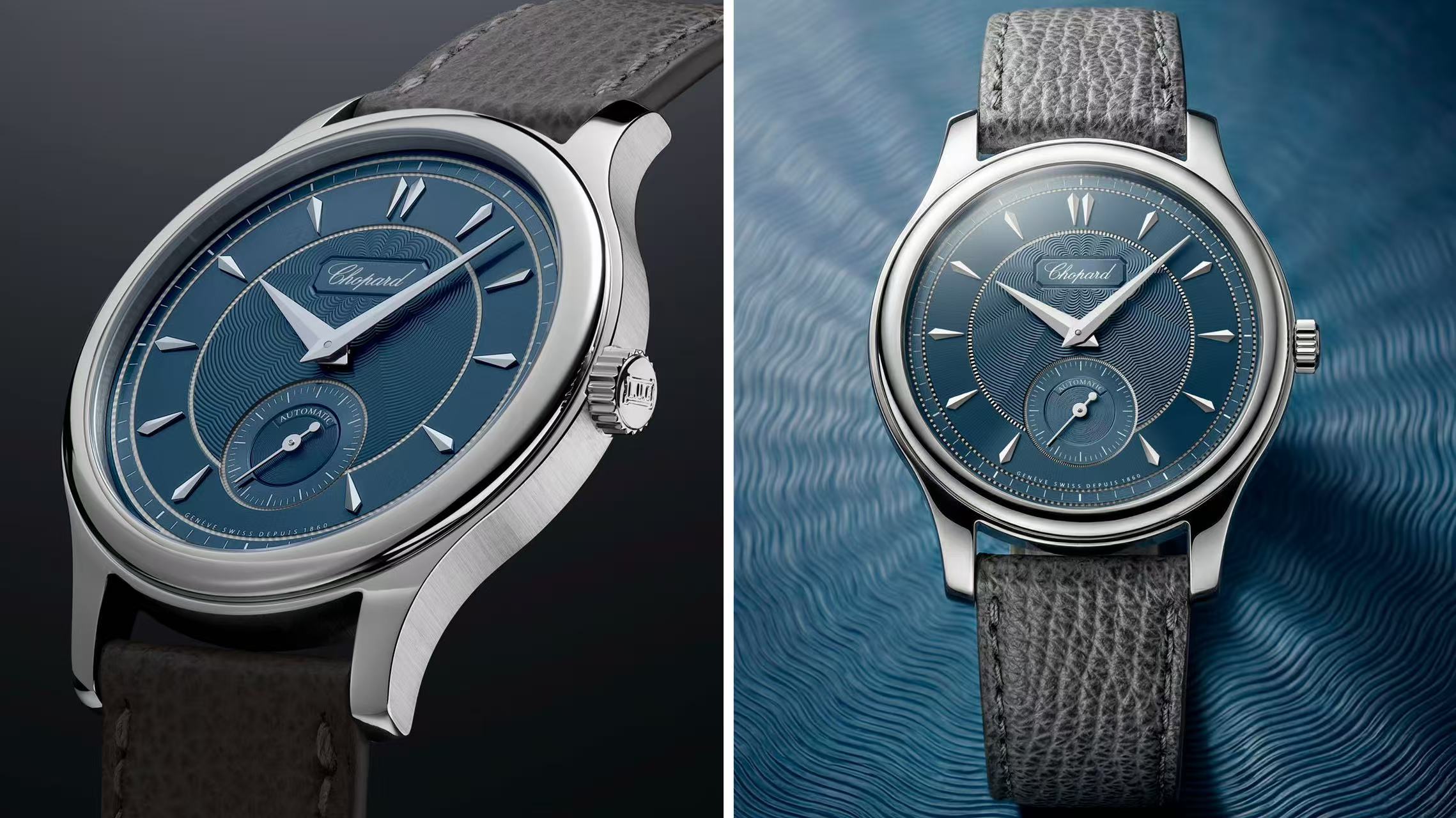 全新腕表采用36.5毫米表壳,由Lucent Steel精钢打造,搭配“阿勒兹蓝“表盘,色调灵感源自流经工坊所在地区的阿勒兹河,表带搭配灰色粒面小牛皮。白18K金表盘中央饰以手工玑镂纹,由手工艺大师操作传统玑镂雕花车床雕刻完成,赋予盘面深邃层次。腕表搭载L.U.C Caliber 96.40-L机芯,厚度仅3.3毫米,双发条盒结构提供65小时动力储存,停秒功能以及鹅颈微调装置,确保精准走时的同时兼顾便捷调校。