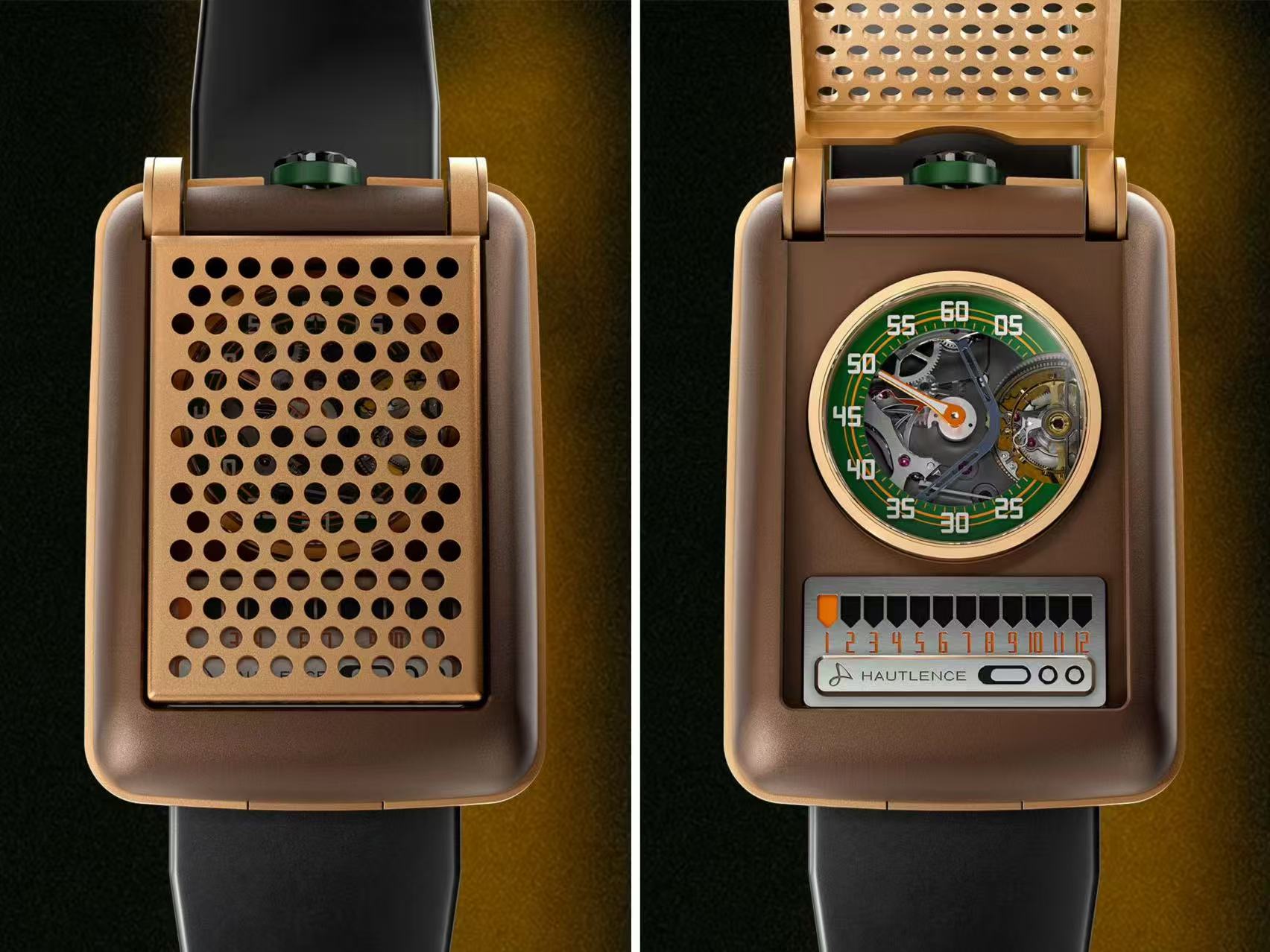 复古未来主义矩形表壳以5级钛金属打造,铰链式翻盖表面为镂孔格栅设计,翻开表盖,腕表的自制机芯搭载与Agenhor合作开发的线性跳时模块,显示方式采用水平布局,正如随时准备科幻作品中向太空发送信号的传输链路。小时在矩形窗口中跳转,分钟在圆形表盘显示。表盘中央的一分钟飞行陀飞轮配以双游丝,创造出技术与趣味同在的时间显示方式。腕表限量发行3枚。
