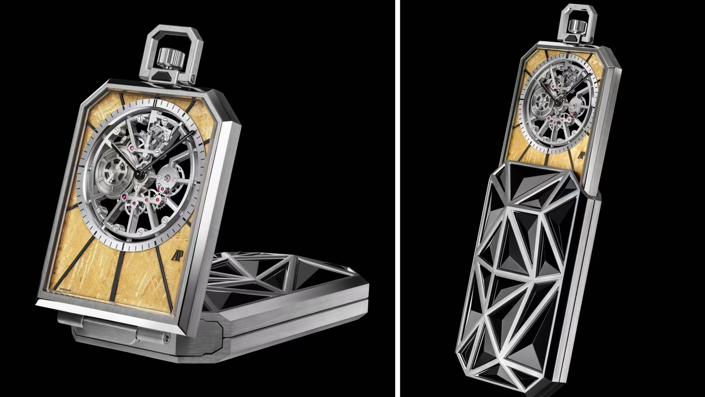 “Établisseurs Nomade漫行者”怀表致敬多用途时计传统,以多面切割金属与天然宝石交织构成建筑感表壳,可呈现表盖闭合、开启或悬垂三种状态,配备特别设计的钛金属或黄金链条。怀表搭载的Calibre 7501机芯以2022年问世的超薄Calibre 7121为基础,采用传统手工微型钢锯进行镂空处理,桥板同时兼作时标。此款作品亦将于2026年推出五种不同天然宝石组合的款式。