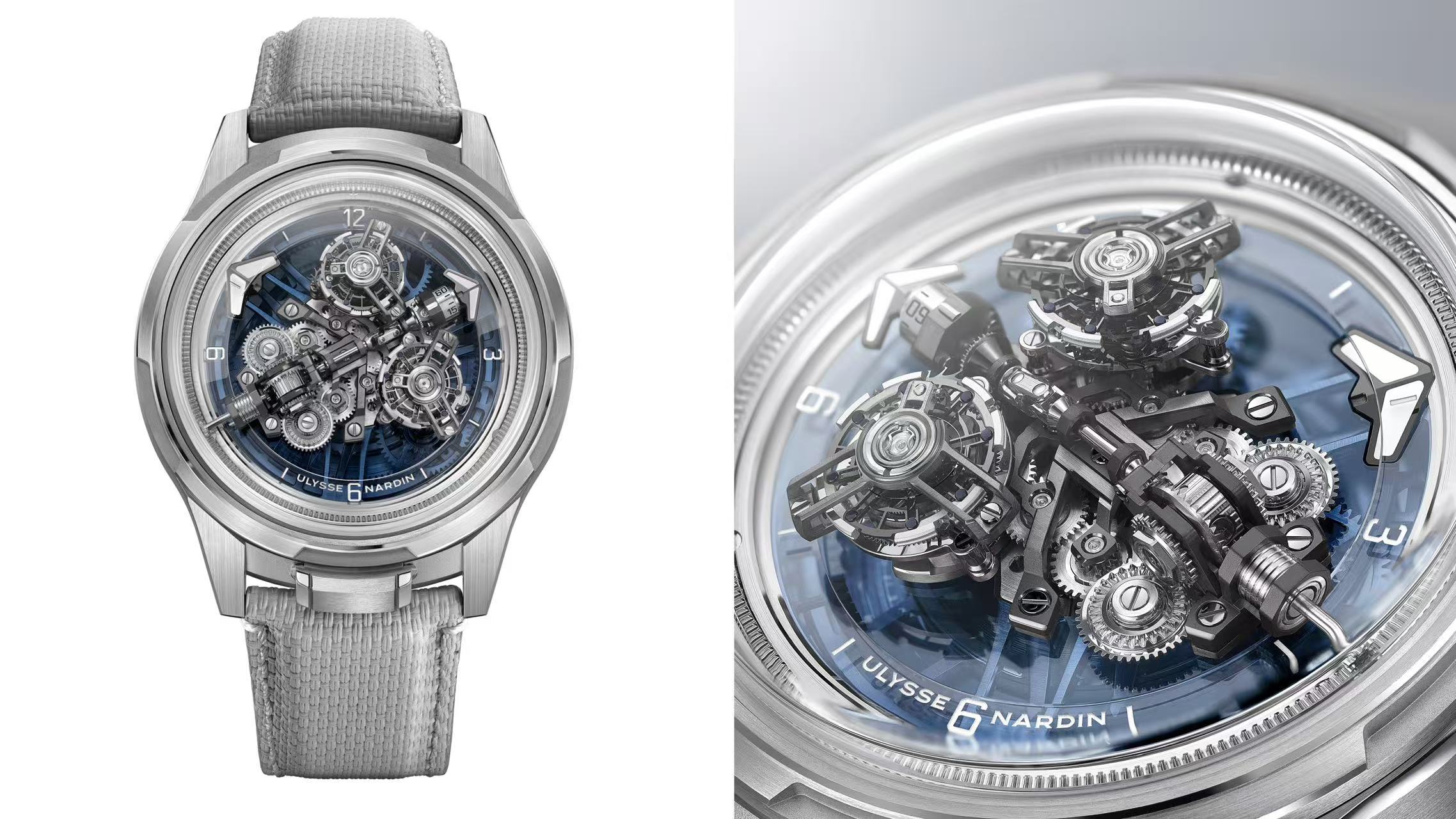 Freak奇想系列新作核心为品牌自制UN-252机芯,历时4年研发,由511个零件组成,承载于全新44毫米白金表壳之内,为世界首款融合双陀飞轮与卡罗素结构的自动上链腕表。腕表还融合了自2001年Freak奇想系列问世以来的35项创新专利,包括引入世界最小差速器和直径仅4.8毫米的全新专利万向节系统,确保能量无缝传递。与此同时,专利Grinder磨床式自动上链系统可敏锐捕捉腕间动作,并转化为机芯所需的能量。