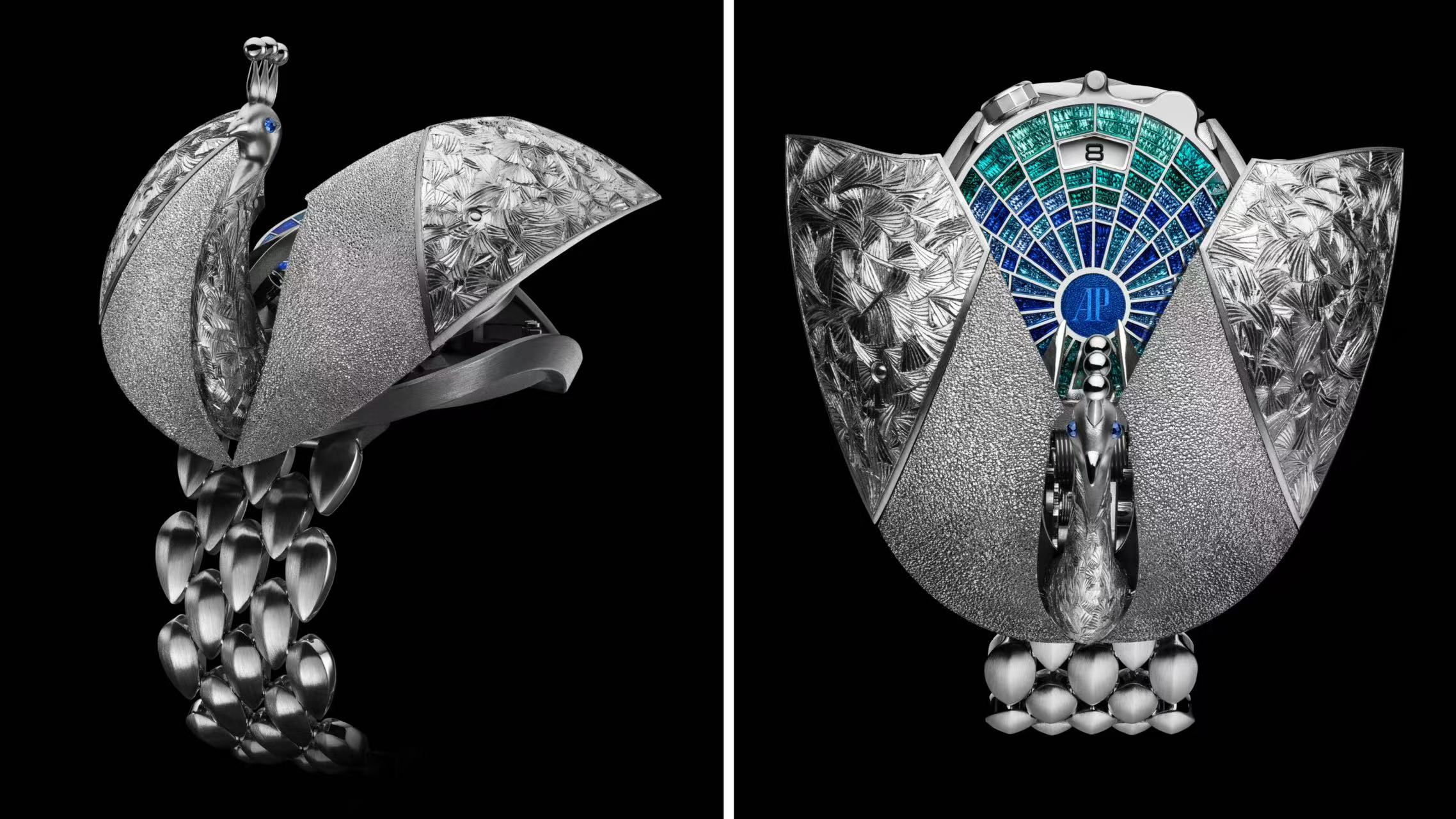 “Établisseurs Peacock雀影羽翎”腕表由珠宝工艺大师、珐琅大师、雕刻大师与制表师通力协作完成,旨在重释隐秘式时计的魅力。腕表在闭合时呈现白金甲虫造型,轻轻一按,翅膀与头部徐徐展开,手工打造的微型孔雀随即显现,双翼之间展露手工精雕的半透明珐琅表盘,象征孔雀华丽尾羽。腕表搭载Calibre 3098.2手动上链机芯,柔韧的白金链带,由数十枚精心雕刻的镂空羽毛造型链节组成。此款作品将于2027年推出三种不同款式。
