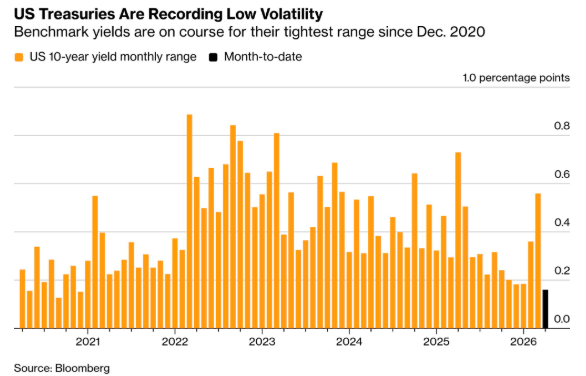 基准10年期美债收益率周四盘中一度上涨5个基点至4.35%,随后回落至4.32%附近。目前,金融市场普遍担忧,中东战事升级将导致霍尔木兹海峡长期关闭,加剧能源供应中断。随着投资者难以保持强烈的交易意愿,10年期美债收益率本月有望创下自2020年12月以来最窄的月度交易区间。
