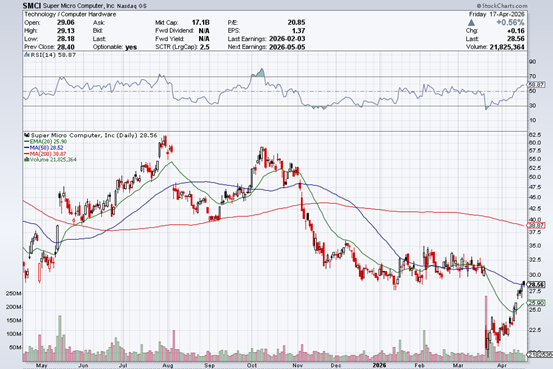 当前SMCI股价约28.56美元,较2024年历史高点122.9美元跌去约77%,较2026年3月20日的暴跌低点约20.5美元,也已反弹约40%。