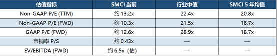 从纯数字角度看,SMCI目前的估值极具反差感:公司年营收预计约400亿美元,而当前市值仅约171亿美元,市销率(P/S)不足0.5倍。市盈率方面,非GAAP动态PE约为10倍,较科技行业中值低约52%,也较公司自身5年平均估值低约38%。