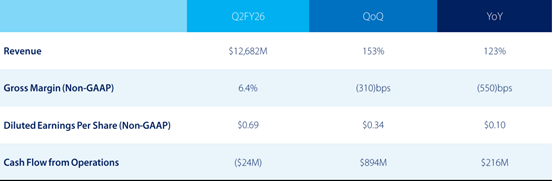 从最新的2026财年第二季度(截至2025年12月)财报来看,SMCI呈现出明显的“增收不增利”风险,但营收增速依然冠绝全行业: