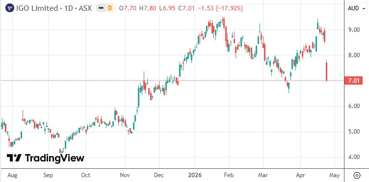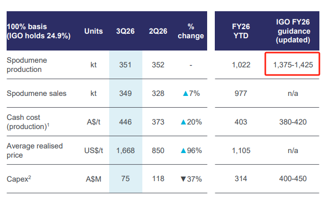 IGO在官方文件中写道,公司将格林布什锂矿26财年的产量指引降至1,375-1,425千吨,调整前为1,500-1,650千吨,最高端降幅达13%。(IGO的26财年截至2026自然年6月30日)