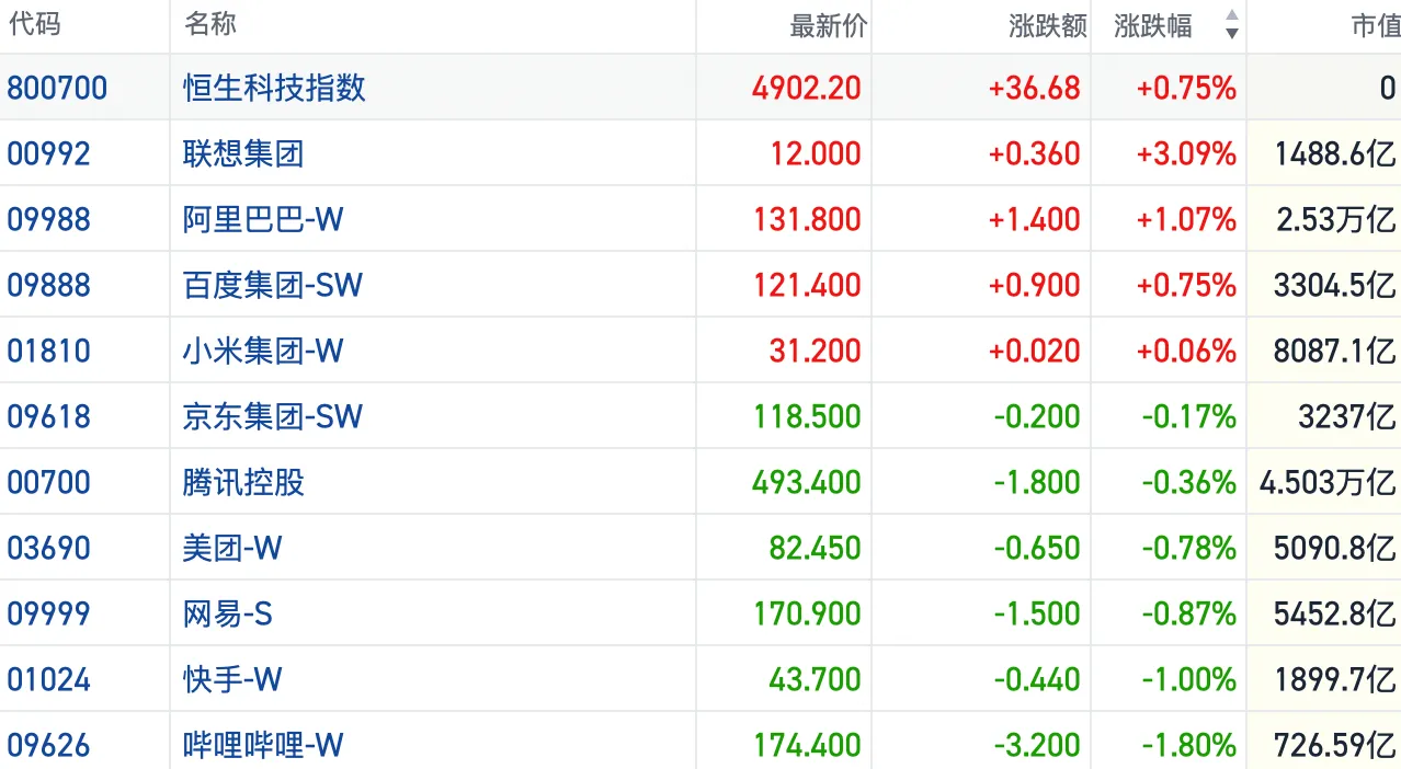 盘面上,今日大型科网股部分拉升转涨,其中阿里巴巴涨1%,百度收涨0.75%,小米飘红,京东、腾讯、美团仍旧下跌;