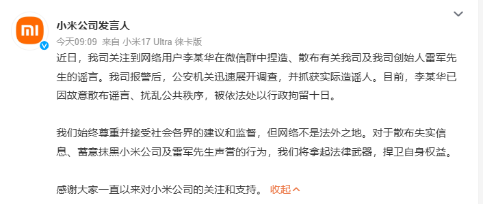 财联社4月26日讯,今日,小米公司发言人微博发文:近日,我司关注到网络用户李某华在微信群中捏造、散布有关我司及我司创始人雷军先生的谣言。我司报警后,公安机关迅速展开调查,并抓获实际造谣人。目前,李某华已因故意散布谣言、扰乱公共秩序,被依法处以行政拘留十日。我们始终尊重并接受社会各界的建议和监督,但网络不是法外之地。对于散布失实信息、蓄意抹黑小米公司及雷军先生声誉的行为,我们将拿起法律武器,捍卫自身权益。感谢大家一直以来对小米公司的关注和支持。