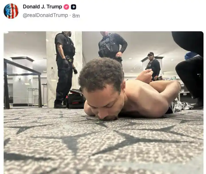 特朗普发布会前于社交媒体上率先发布了一张照片,照片显示一名男子躺在华盛顿希尔顿酒店的地上。该男子似乎是嫌疑人。