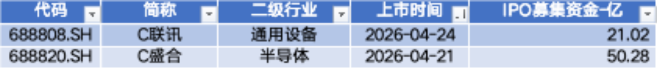 2、本周2家科创板公司IPO:联讯仪器与盛和晶微,分别募资21亿与50亿。此外,本周没有科创板公司上会。