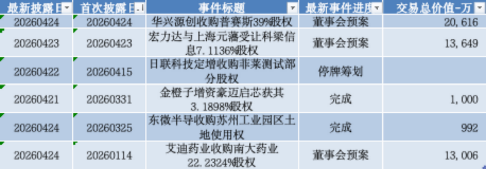 本周科创板并购最新进展共6条:华兴源创收购普赛斯39%股权、宏力达与上海元藩受让科梁信息7.1136%股权、日联科技定增收购菲莱测试部分股权、金橙子增资豪迈启芯获其3.1898%股权、东微半导收购苏州工业园区土地使用权、艾迪药业收购南大药业22.2324%股权,其中前两条属于本周首次披露。