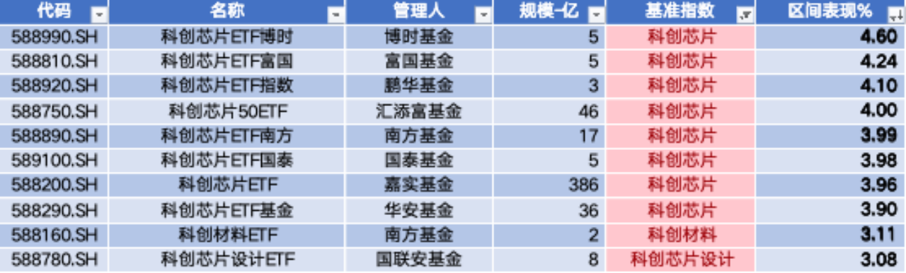 上表是本周市场表现按照降序排列的科创板ETF基金,本文选取前十名。本周科创板ETF中,芯片设计主题ETF表现居前。