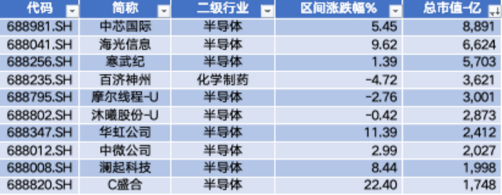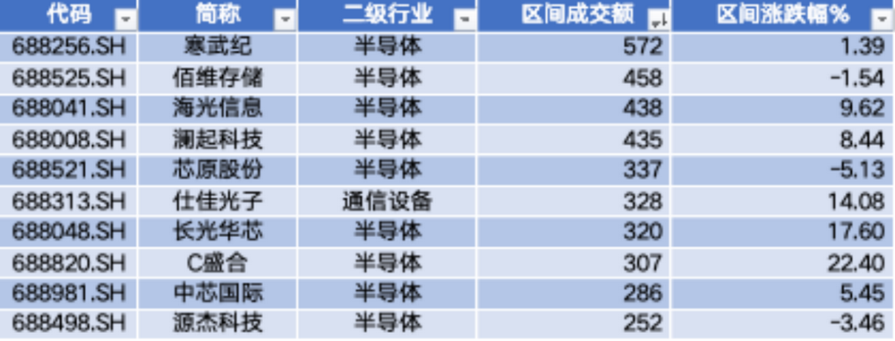 上表是本周成交额(亿)前十公司,分别为:寒武纪、佰维存储、海光信息、澜起科技、芯原股份、仕佳光子、长光华芯、C盛合、中芯国际、源杰科技。