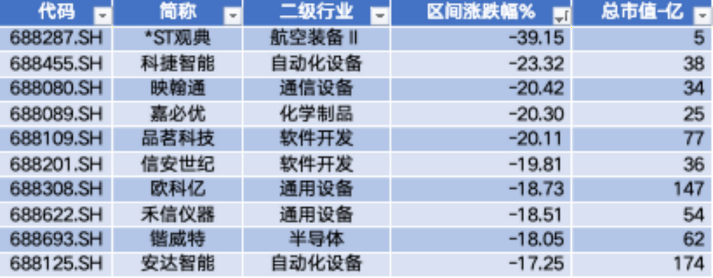上表是本周跌幅榜前十公司,分别为:*ST观典、科捷智能、映翰通、嘉必优、品茗科技、信安世纪、欧科亿、禾信仪器、锴威特、安达智能。