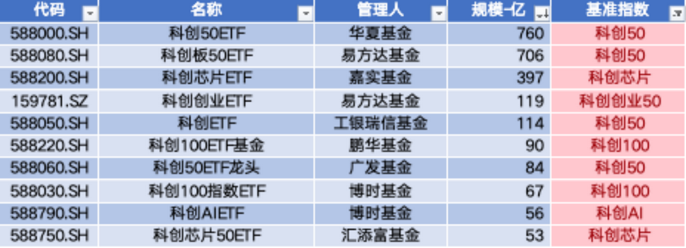 上表是按照最新规模统计,最大的10只科创板相关公募基金,各自有跟踪指数。规模较大的科创板ETF大致可分为三类:科创50、科创100、双创50。
