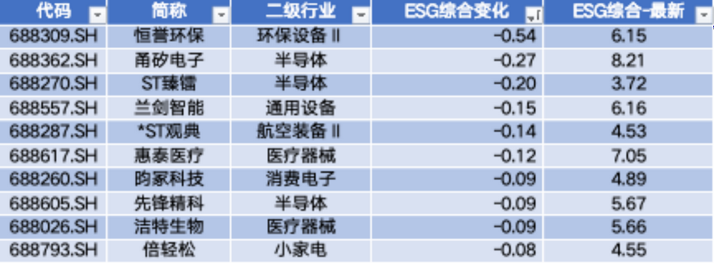 上表是ESG评分变化下降的前十家公司,分别为:恒誉环保、甬矽电子、ST臻镭、兰剑智能、*ST观典、惠泰医疗、昀冢科技、先锋精科、洁特生物、倍轻松。