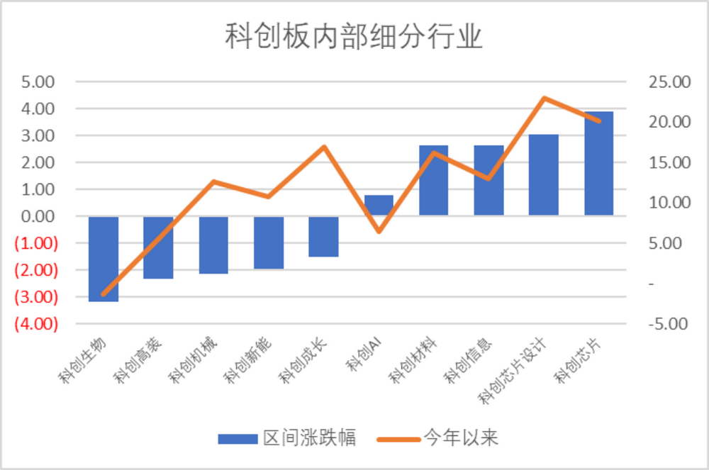 如上图所示,本周科创板内部呈现分化,芯片设计板块居前,生物医药板块居末。