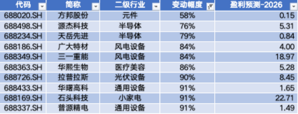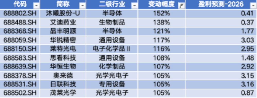 上表是本周盈利预测(规模净利润预测值)中值上调/下移的公司,其中上调有29家,本文选取其中幅度最大的前十家(若不足十家则按实际数量列示),分别为:沐曦股份-U、艾迪药业、晶丰明源、华锐精密、莱特光电、思看科技、华恒生物、奥来德、日联科技、茂莱光学。