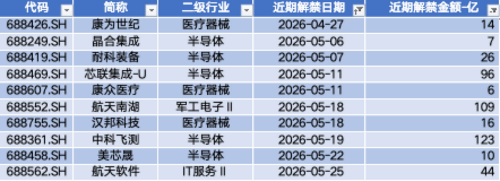 经过wind数据终端查询,近期有解禁的公司,本文剔除金额小于5亿的部分,然后按照时间顺序由近至远,选取前10家公司,分别为:康为世纪、晶合集成、耐科装备、芯联集成-U、康众医疗、航天南湖、汉邦科技、中科飞测、美芯晟、航天软件。