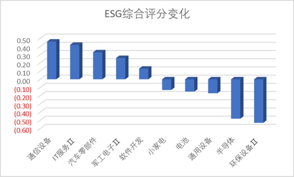 上图是本周ESG评分变化行业分布,本文统计了排名最高和最低的5个行业,本周ESG评分变化排名变化最大的细分行业:通信设备、IT服务、汽车零部件。