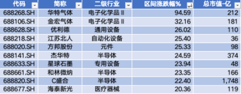 上表是本周涨幅榜前十公司,排名前十的公司分别是:华特气体、金宏气体、优利德、江苏北人、方邦股份、杰华特、星球石墨、和林微纳、C盛合、海泰新光。
