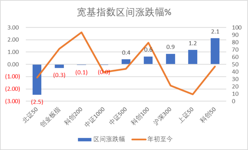 本周,A股主要宽基指数呈现分化,科创50涨2.1%居前,北证50跌2.5%居末,其中科创100涨0.6%,科创200跌0.1%。内部同样呈现分化,芯片设计板块居前,生物医药板块居末。公司层面,华特气体领跑科创板。