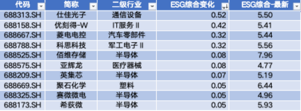 上表是ESG评分变化上升的前十家公司(剔除新上市公司),分别为:仕佳光子、优刻得-W、菱电电控、科思科技、佰维存储、亚辉龙、英集芯、聚石化学、赛微微电、希荻微。