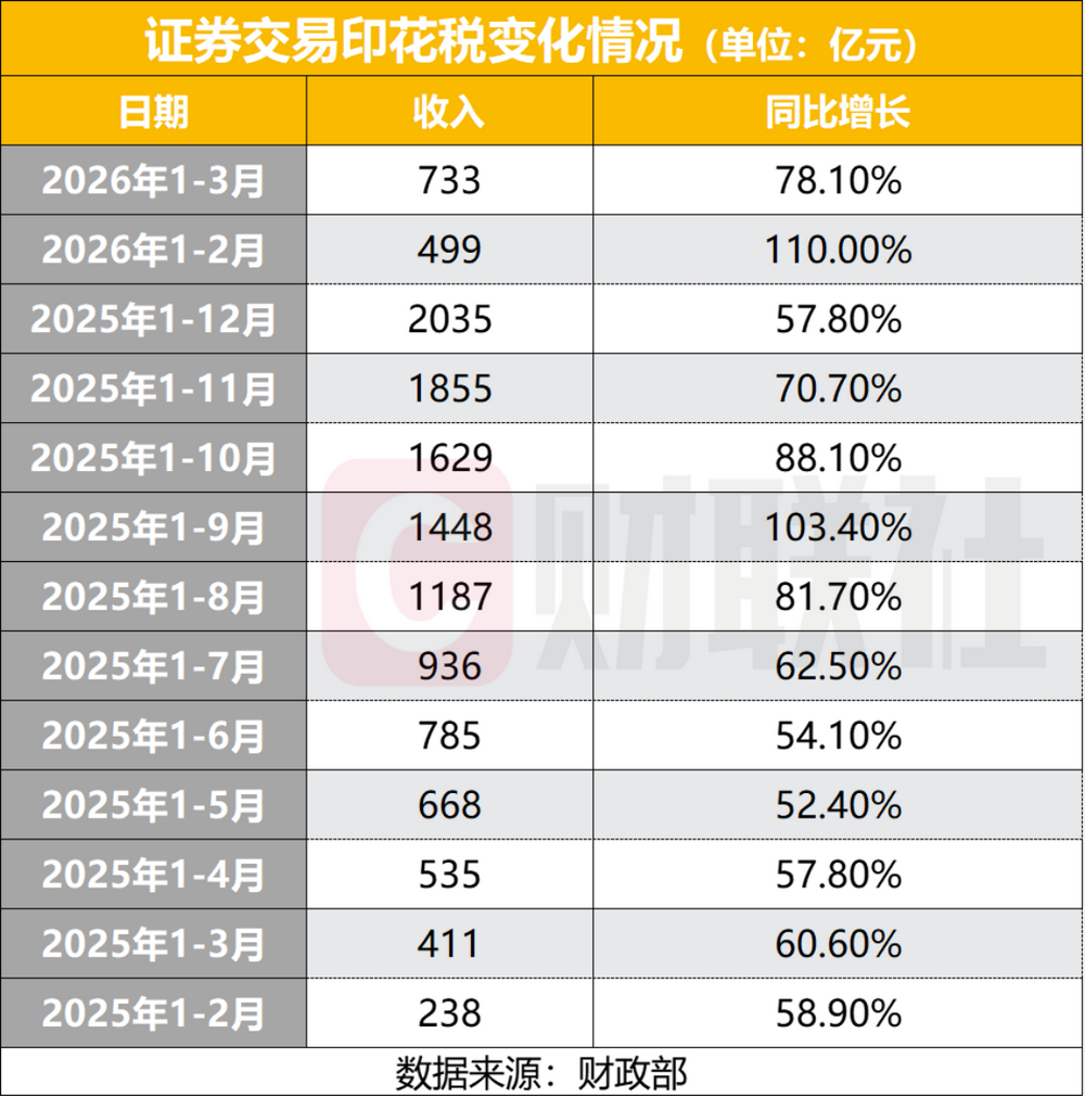 一是证券交易印花税已连续15个月实现同比增长,且增长势头在2026年进一步提速。2025年全年,印花税收入达2035亿元,同比增长57.8%,成功扭转2024年的下滑态势。进入2026年,增长动能持续强化,前两个月收入同比激增1.1倍,一季度累计收入733亿元,同比增长78.1%,呈现出显著的加速上行特征。