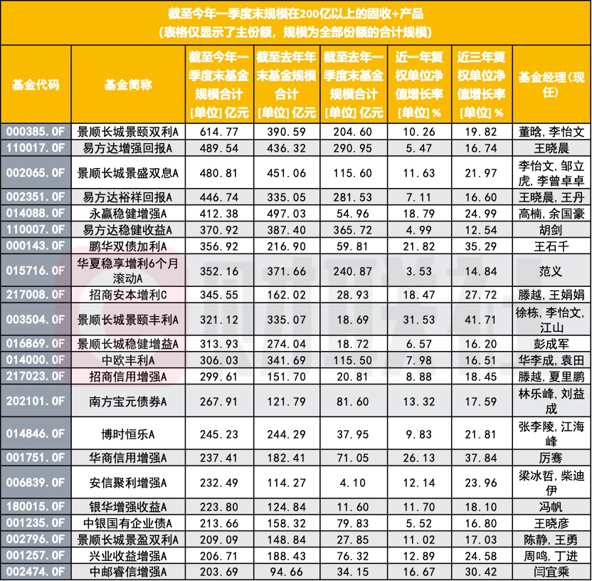 景顺长城景盛双息一季度末规模为480.81亿元,较一年前增加365.22亿元;景顺长城景颐丰利规模为321.12亿元,较一年前增加302.43亿元;景顺长城稳健增益规模为313.93亿元,较一年前增加295.21亿元。