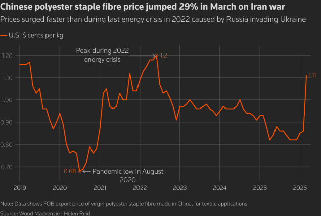 聚酯纤维(中国俗称涤纶)由石油衍生物制成,在纺织业中占据主导地位,占全球纤维产量的59%,应用范围从跑步短裤到连衣裙无所不包。这一领域目前正直接受到霍尔木兹海峡封锁导致的精炼石油产品供应紧张的影响。