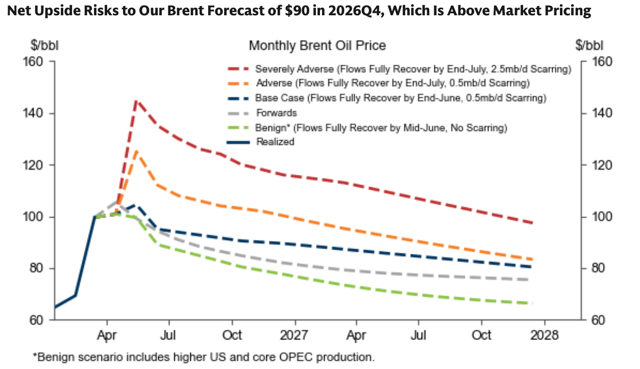 在基准情景下,高盛预计2026年第四季度布伦特油价约为90美元,但风险明显偏上行。