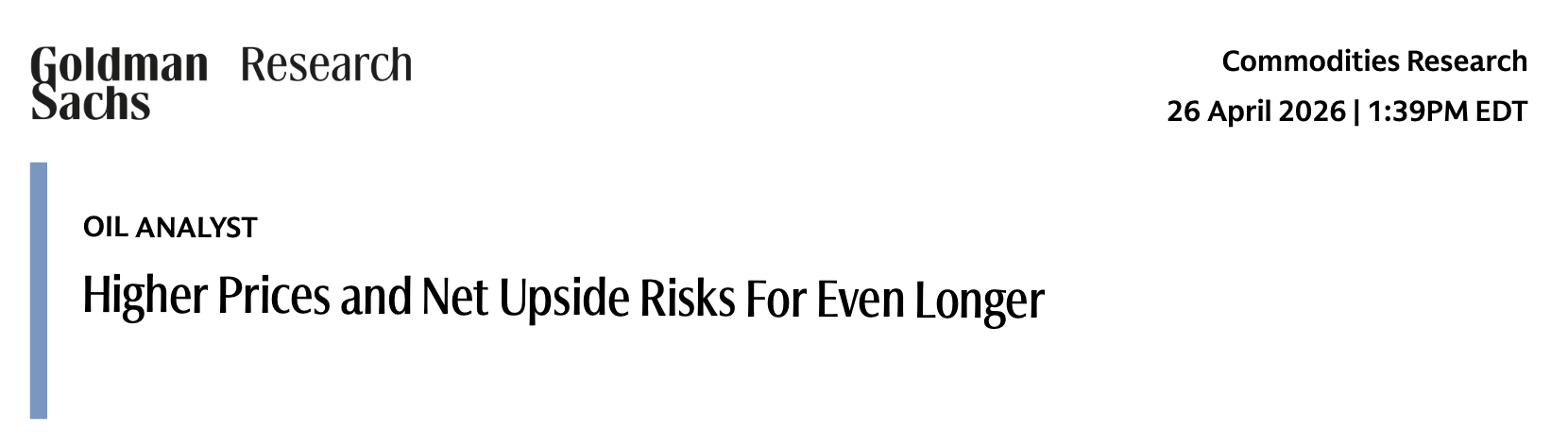 Daan Struyven等分析师在4月26日的报告中表示,在基准情景下,将2026年第四季度布伦特和WTI原油价格预测分别上调至每桶90/83美元(此前为80/75美元);2027年的预测也同步上调至每桶85/80美元。