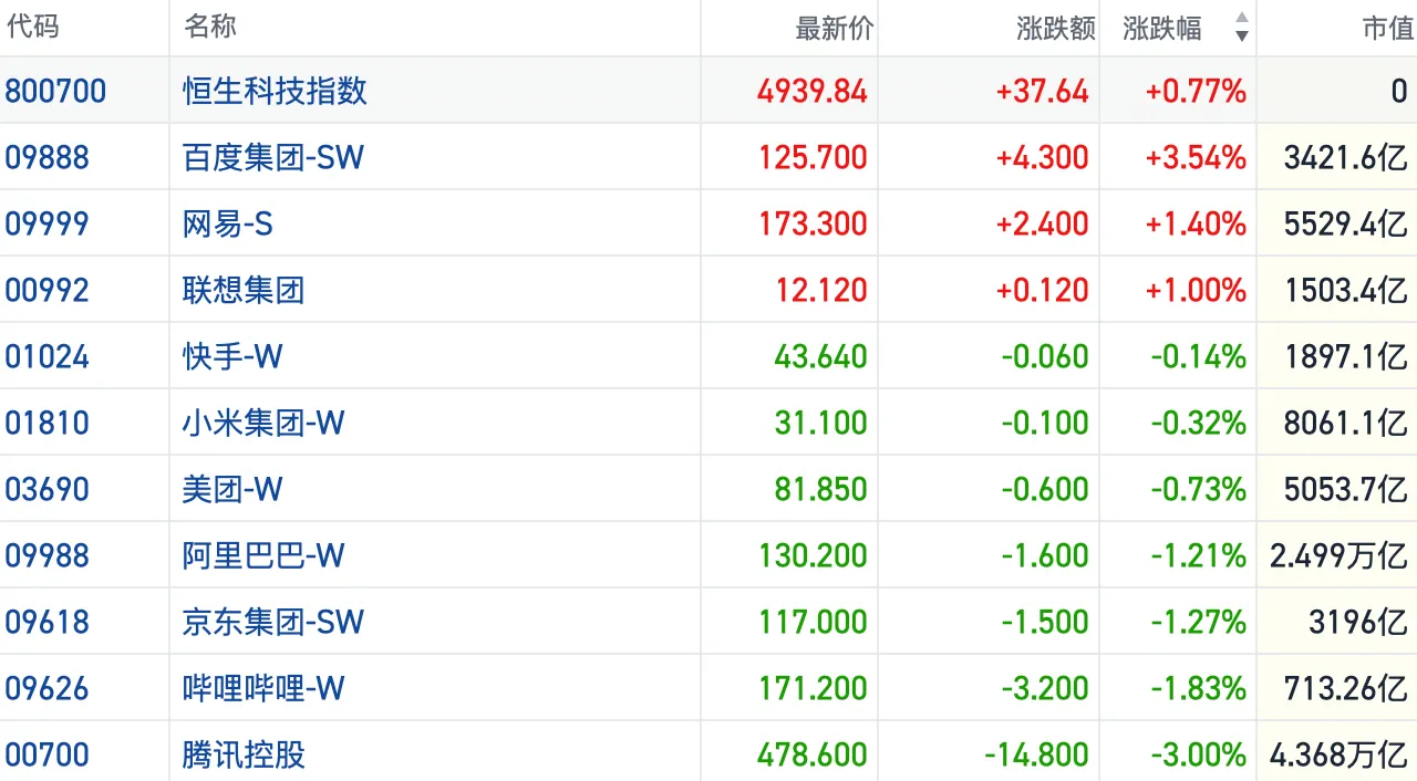 盘面上,大型科网股再度出现疲软走势。腾讯跌3%,京东、阿里巴巴跌1.2%,其中百度逆势涨3.54%,网易涨1.4%。