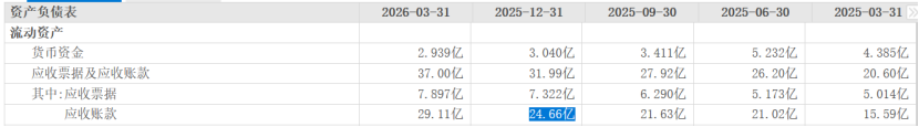 需要指出的是,今年一季度公司经营活动产生的现金流量净额-6613.01万元,上年同期为-1.37亿元,同比降幅有所收窄。此外,公司今年一季度应收账款为29.11亿元,较2025年末的24.66亿元,增加18.05%;公司当期应收账款占2025年年报归母净利润2.40亿元的比例高达1212.92%,其回款情况值得关注。