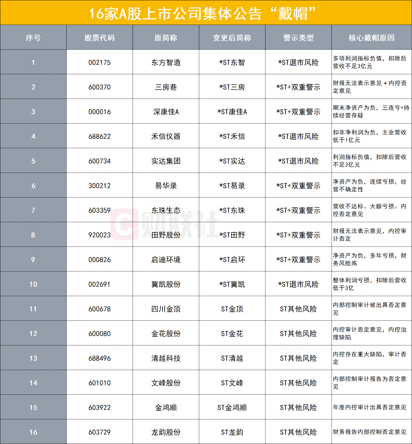 财联社4月29日讯(编辑 沈超)随着A股年报披露进入收官尾声,市场迎来一轮集中“戴帽”潮。多家上市公司因触碰财务指标红线、内控治理存在缺陷、持续经营承压等问题,被监管实施退市风险警示(*ST)或其他风险警示(ST)。