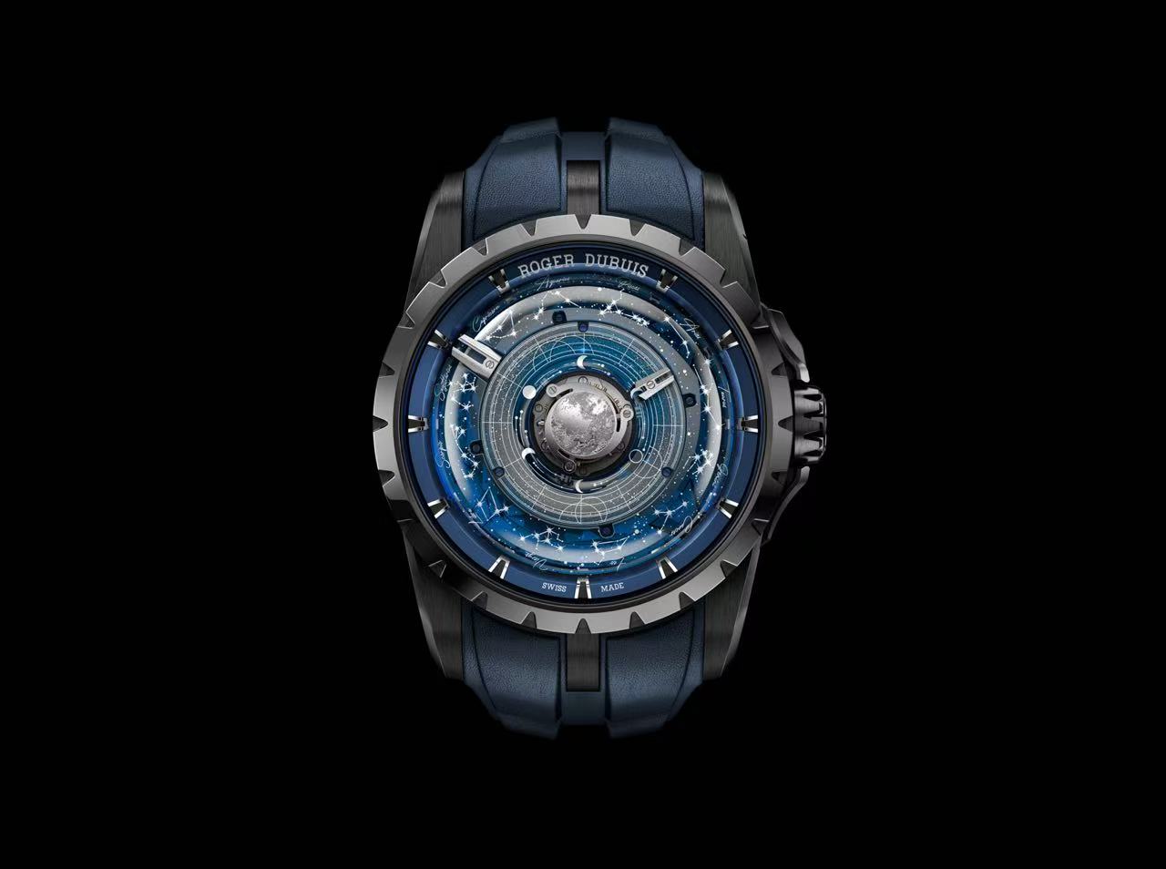 2026年日内瓦钟表展,罗杰杜彼以寰宇律动为主题呈现了高级制表对浩瀚无垠的诠释。全新推出的王者系列星河寰宇中置陀飞轮腕表,于陀飞轮上呈现月亮造型,上层笼架饰有雕刻的月亮图案,覆以手工雕刻的镀铑黄铜板。表盘采用蓝色穆拉诺工艺玻璃手工绘制,盘缘采用蓝色CVD涂层工艺,呈现出深邃的寰宇蓝色调。