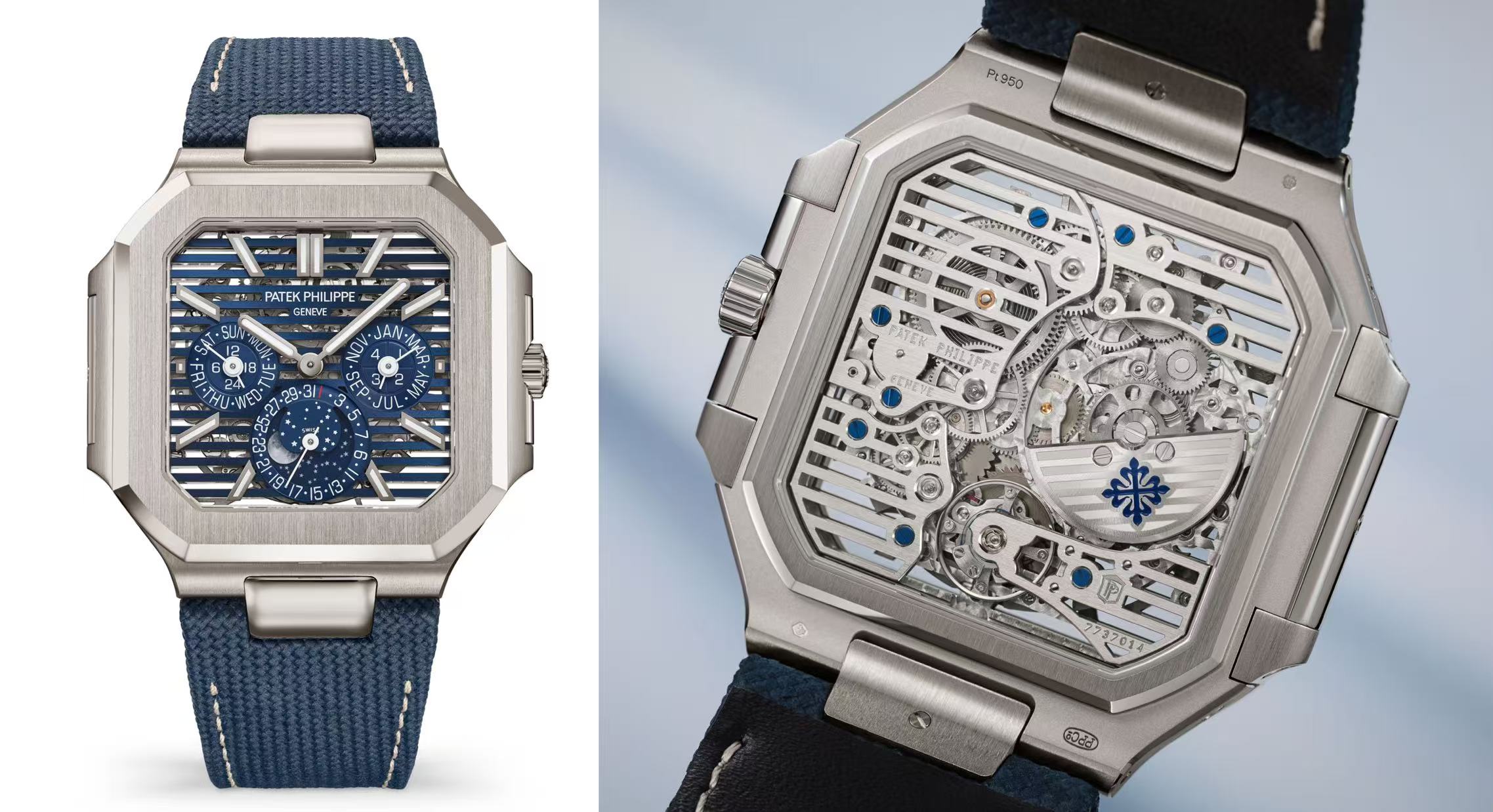 2024年首款Cubitus诠释了运动感与正装气质的完美融合,今年百达翡丽推出系列首款超级复杂功能腕表:万年历镂空腕表Ref. 5840P-001,具备分钟、秒钟、日期、星期、月份、月相及闰年显示功能。腕表搭载全新开发的28-28 Q SQU方形镂空机芯,由313 枚部件组成,此次百达翡丽亦首次为机芯赋予单色美学,通过上色螺丝、微型自动陀手工雕饰涂漆Calatrava十字星图案点缀蓝色细节,为整体注入灵动质感。