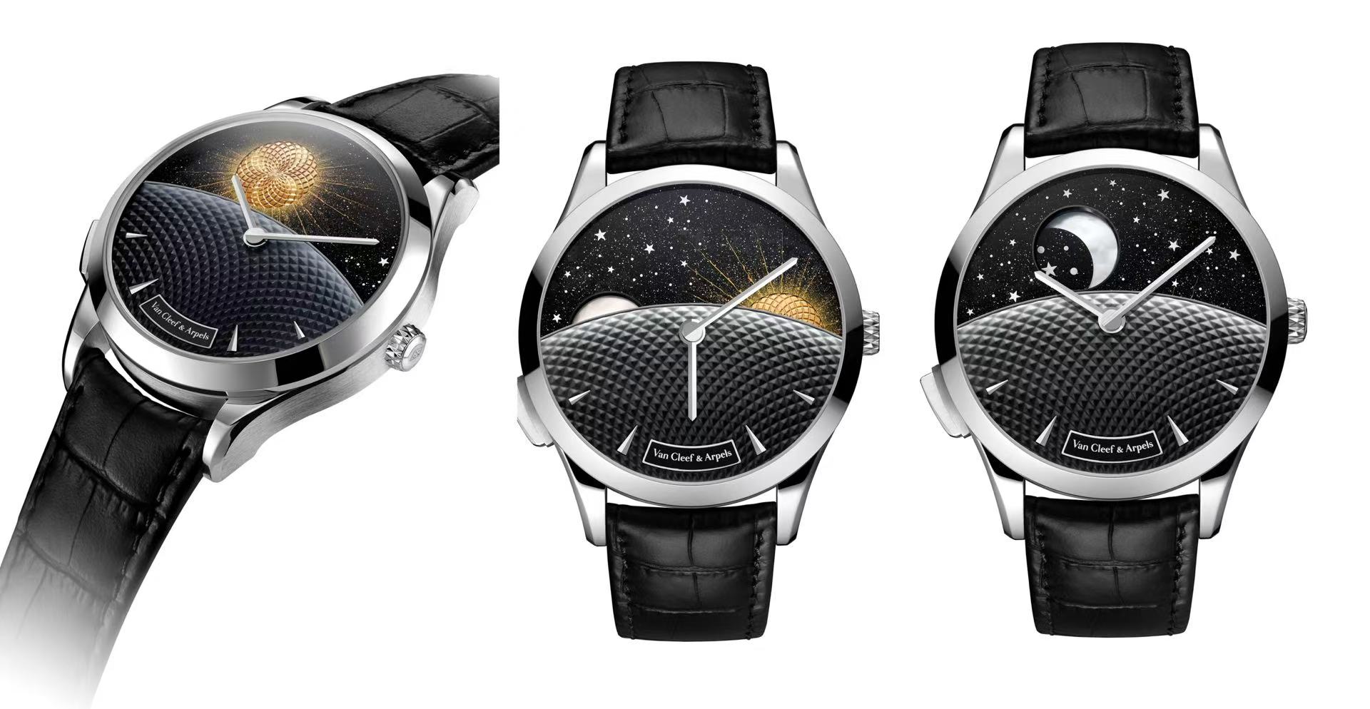诗意苍穹是梵克雅宝今年表展的主题,品牌以Poetic Complications诗意复杂功能腕表系列新作——Midnight Jour Nuit Phase de Lune腕表,尝试捕捉明月盈亏之间的诗意苍穹。42毫米白K金表壳内,黑色穆拉诺砂金石玻璃复现夜空景象。昼夜流转间,饰以玑镂雕花的金质太阳渐隐天际,白色珍珠母贝月亮冉冉上升,卧于丙烯酸勾勒的繁星之间,两大天体此起彼落。