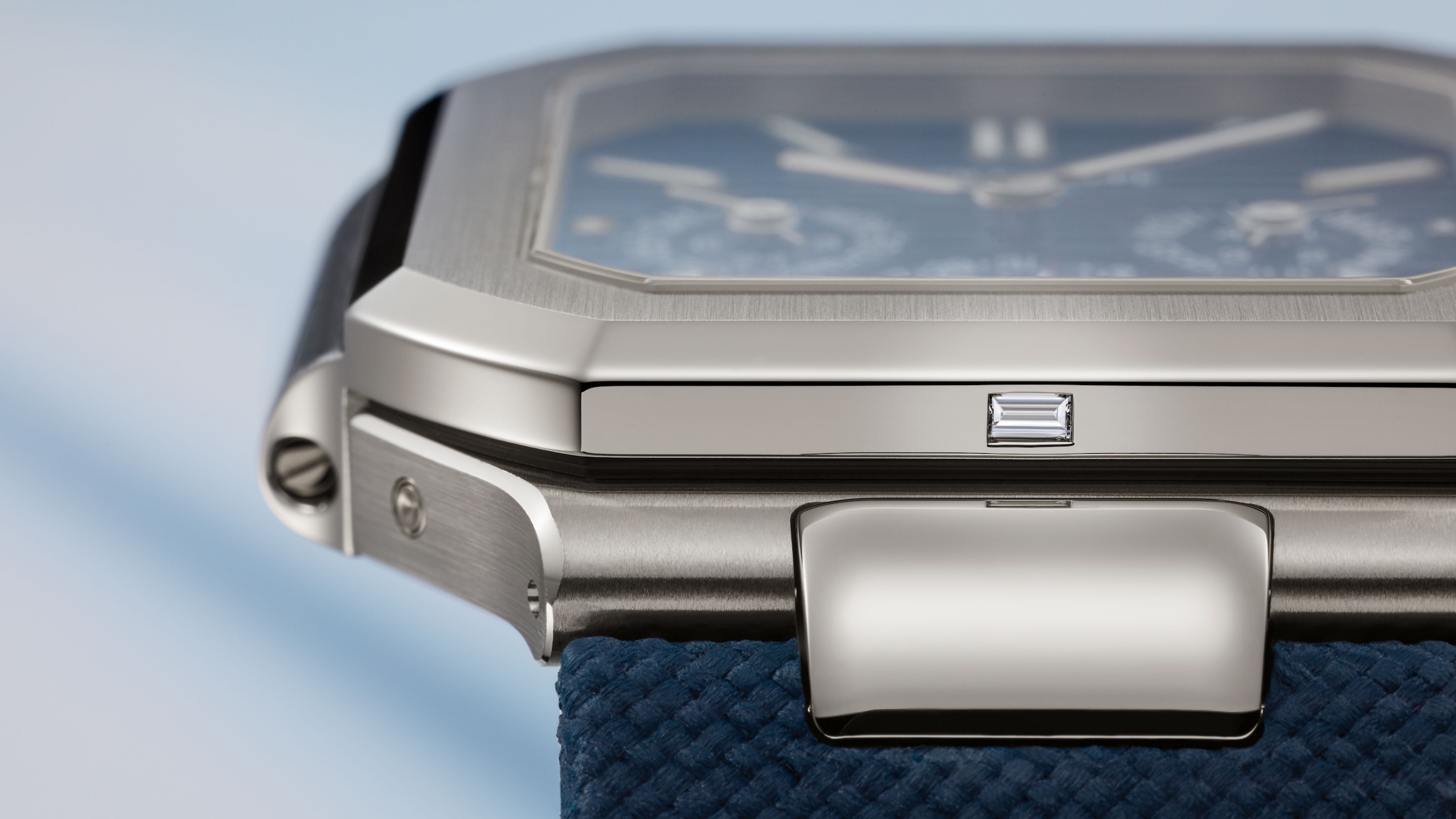 铂金表壳直径45毫米,厚度仅10毫米。圆角方形镂空表盘延续系列特色,经激光切割而成的纤细饰纹与机芯结构呼应,水平缎纹磨砂处理衬托蓝色PVD涂层的明亮光泽。延续传统,表圈6时位置镶嵌了与表壳设计呼应的长形钻石。海军蓝表带以复合材质打造,饰以纹理图案与乳白色撞色缝线,彰显腕表现代前卫的技术美学。