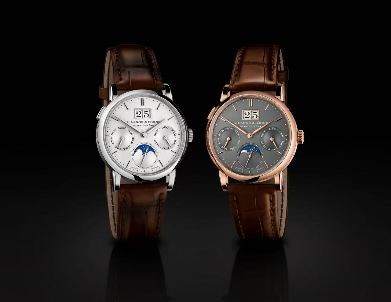 清晰易读一直是朗格萨克森年历系列的核心理念。今年,朗格以全新36毫米紧凑尺寸和全新自动上链机芯重新演绎这一系列,秉持清晰显示风格,腕表12时位置设大日历显示窗,9时位置副表盘显示星期,3时位置副表盘显示月份,6时位置小秒盘上方设月相显示。月相盘以750金制成,覆以深蓝色涂层,其中点缀428颗星星,月亮在繁星点点的夜空中缓缓运行。