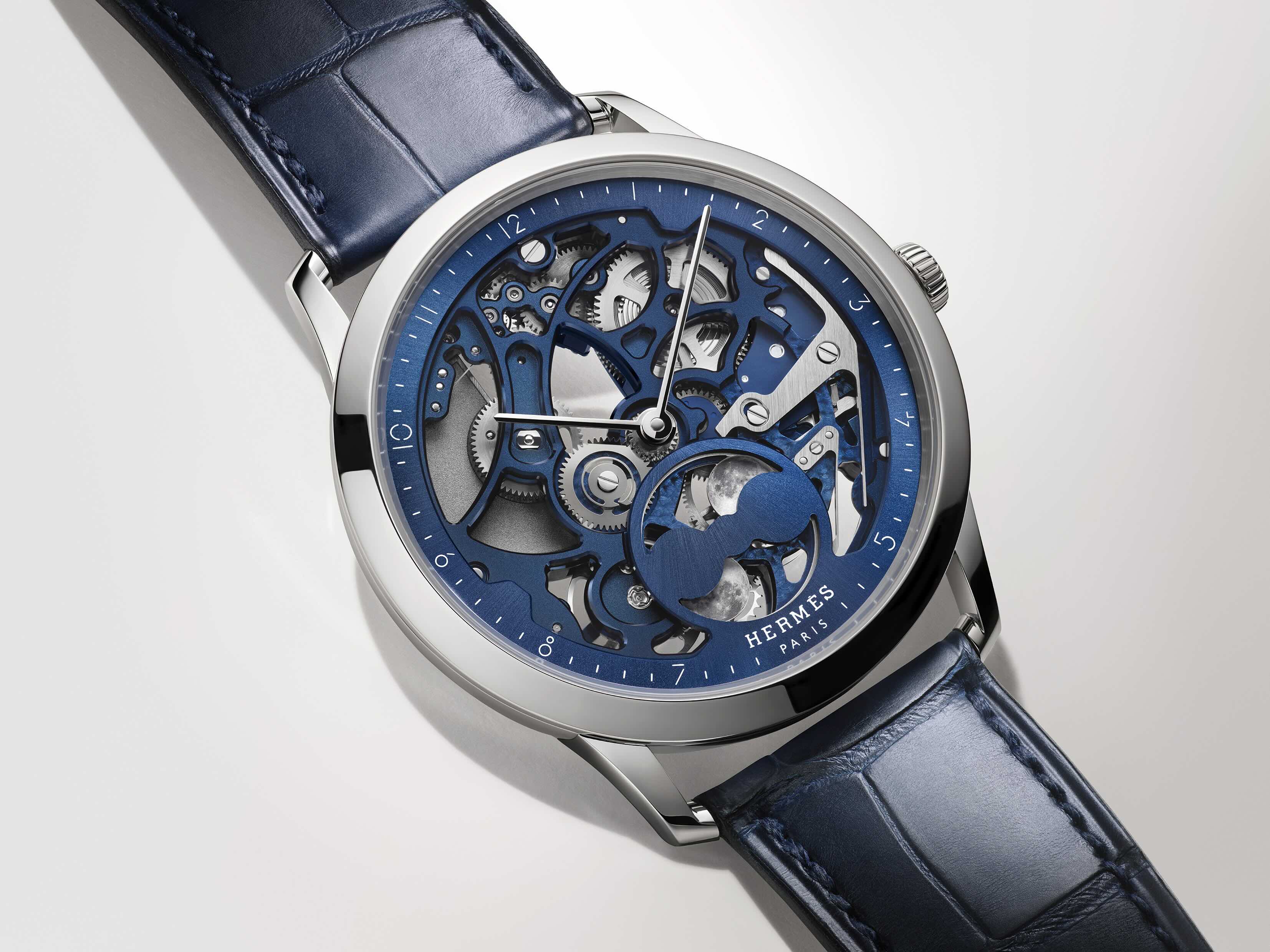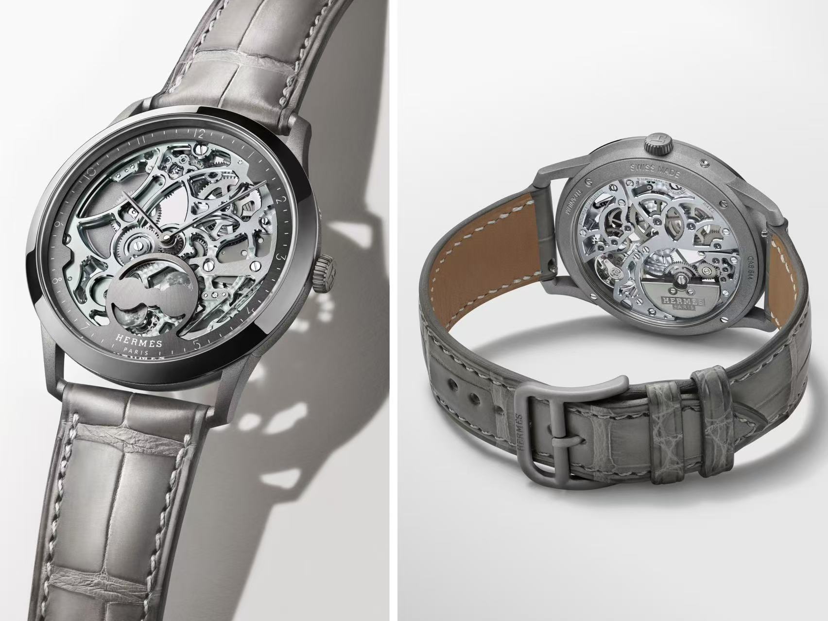 诞生于2015年的Slim d’Hermès系列今年以全新力作Slim d’HermèsSquelette Lune镂空双月相腕表焕新系列。39.5毫米表壳搭配镂空表盘,6点钟位置双月相显示从南、北半球双视角追踪的空中皓月运行周期。腕表由爱马仕自制H1953超薄镂空自动上链机芯驱动,厚度仅3.57毫米,具备48小时动力储存。