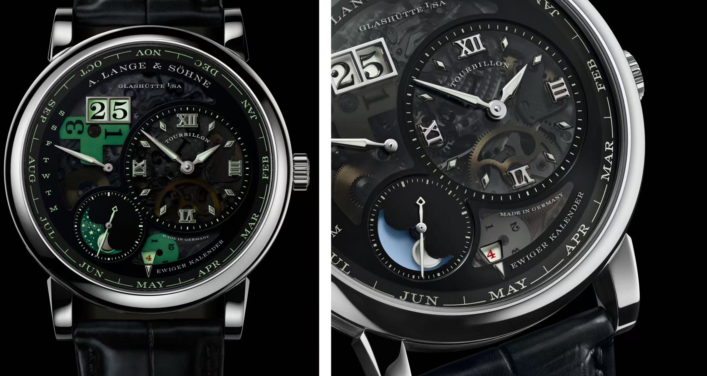 朗格2026年新作朗格1陀飞轮万年历“Lumen”腕表以精妙设计,将品牌两大复杂功能——陀飞轮与万年历功能,融入朗格1标志性偏心表盘布局中,腕表限量发行50枚。全新自制L225.1型自动上链机芯由685枚部件组成,整合陀飞轮(含停秒功能)、万年历与月相显示。逆跳星期显示、小秒针及月相显示与大日历窗口分居等腰三角形三顶点,月份通过表盘外圈旋转环呈现,闰年显示设于6时位置,所有日历均以瞬跳切换。陀飞轮部件经黑色抛光处理,辅以手工雕刻。