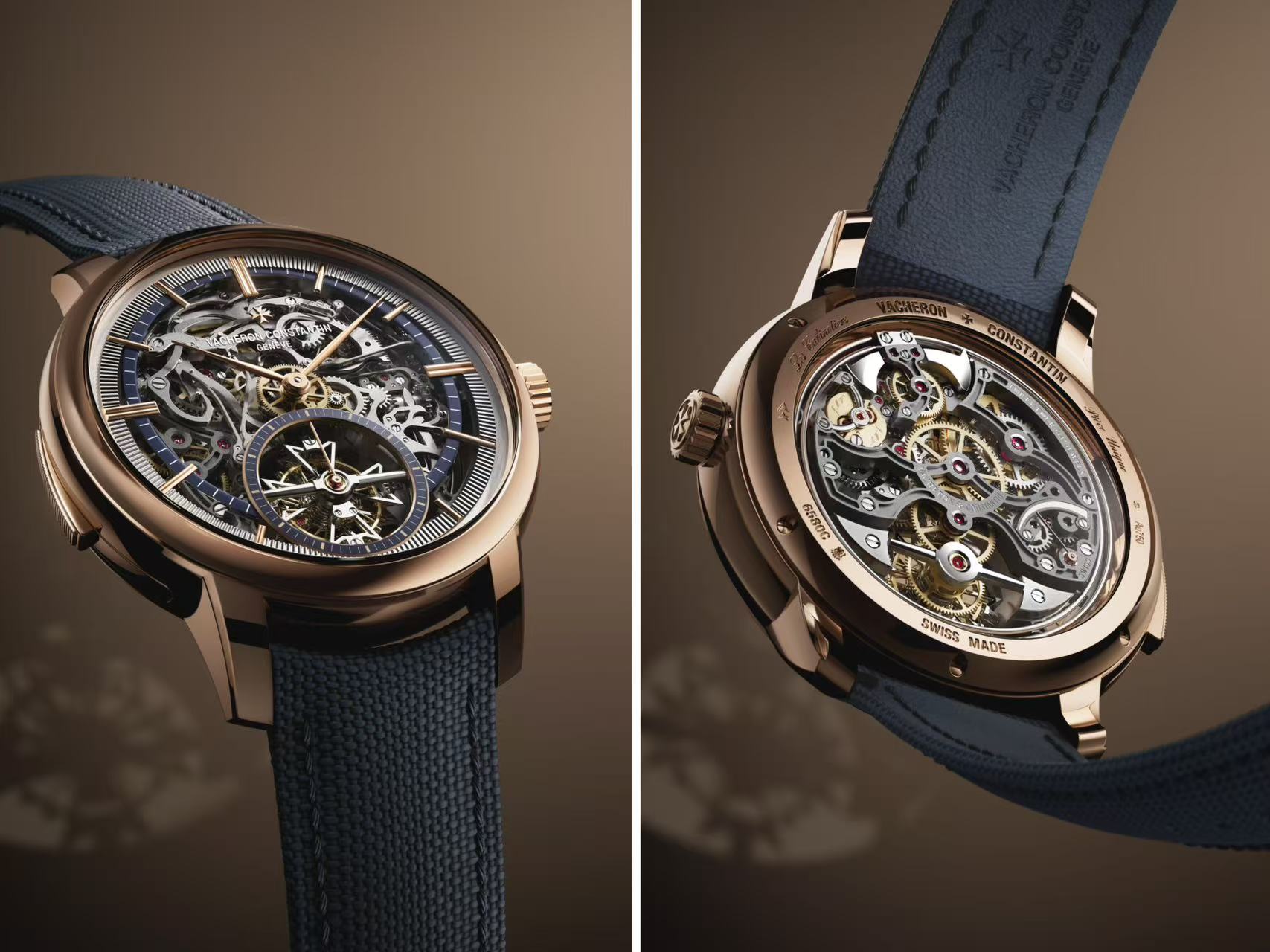 三枚钛金属陀飞轮框架分别以不同速度围绕不同轴线旋转,位置覆盖率达98%,可有效抵消地心引力对腕表精准走时的不良影响。陀飞轮由189枚部件组成,重量仅0.783克。42毫米铂金表壳内,两枚偏心环圈分置表盘上下:上方环圈显示时分,中央镂空显露双发条盒;下方环圈围绕6时位置陀飞轮设有30秒刻度,秒针以红色箭头沿小表盘运行。机芯经16种珍稀工艺润饰,原本仅用于表盘的玑镂雕花与半透明蓝色珐琅工艺同样应用于发条盒盖与夹板。腕表限量20枚。