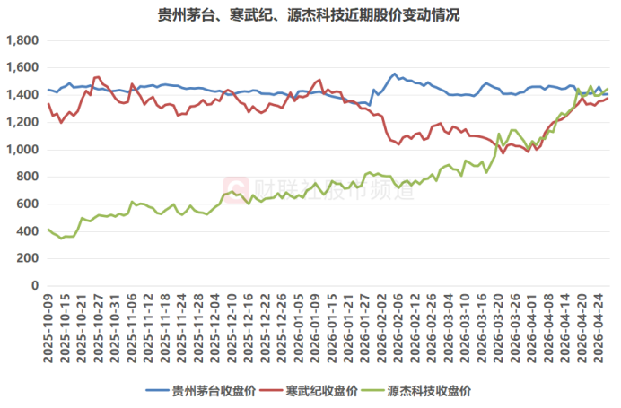 注:贵州茅台、寒武纪、源杰科技近期股价变动情况(截至4月28日收盘)