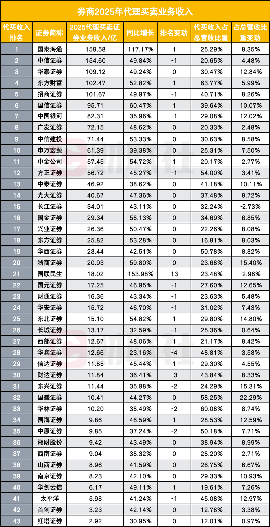 根据财联社记者统计的43家已披露年报券商数据,2025年代理买卖证券业务收入排名中,国泰海通以159.58亿元居首位,同比增长117.17%;中信证券以154.60亿元紧随其后,两者差距仅约5亿元,可谓毫厘之间。