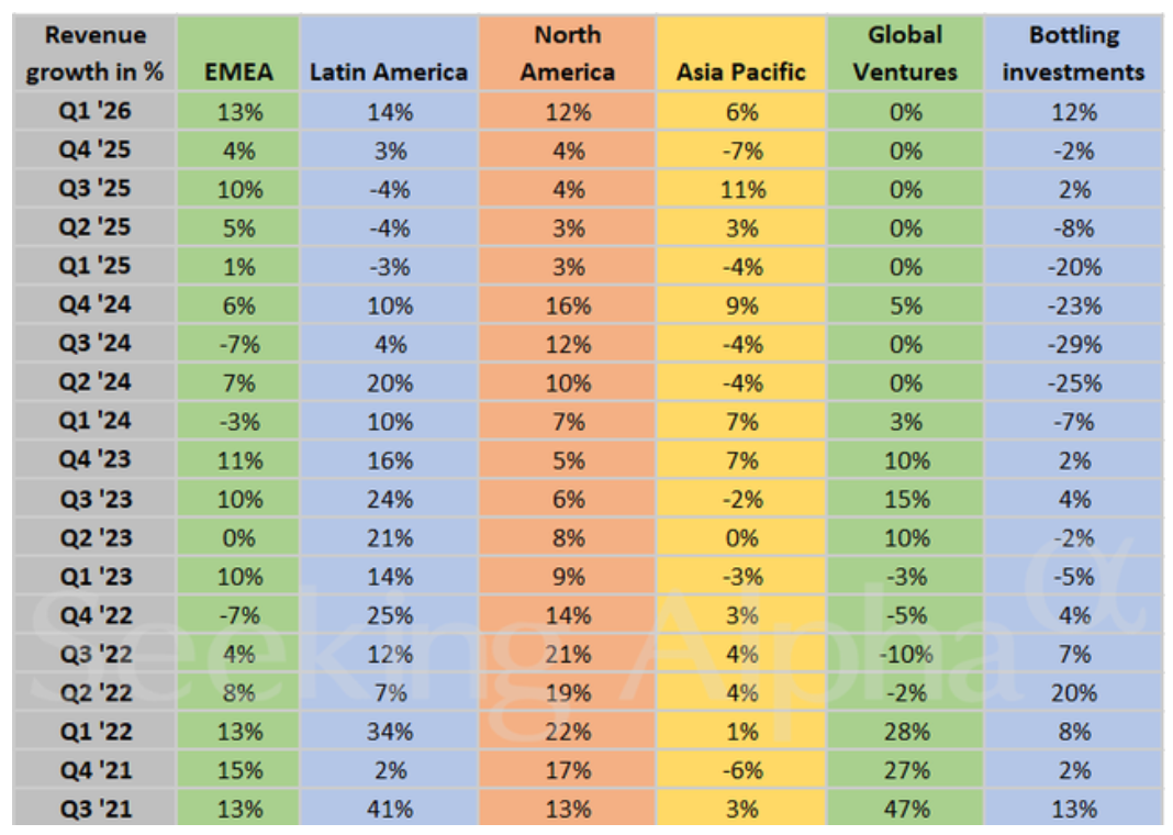 SeekingAlpha统计也显示,可口可乐Q1各大区域的营收出现普遍提速。