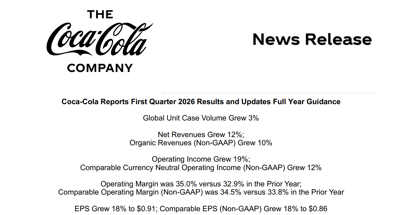 财联社4月28日讯(编辑 史正丞)知名消费品公司可口可乐(Coca-Cola)周二发布截至4月3日的2026财年一季报。在同时满足“钱包吃紧”群体消费碳酸汽水的欲望和高收入群体对高端产品需求的带动下,公司录得近五个季度以来的最佳有机营收增长。