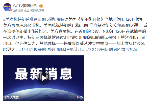 ①据央视新闻援引美国媒体报道,当地时间4月28日美方官员称,美国总统特朗普已指示助手“准备对伊朗实施长期封锁”,旨在迫使伊朗做出“核让步”。