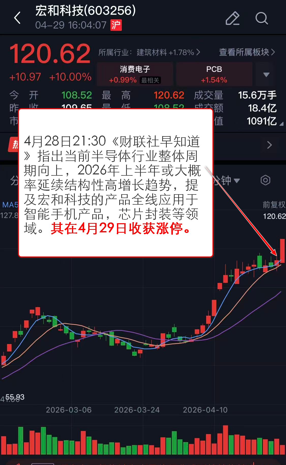 4月28日21:30《财联社早知道》指出当前半导体行业整体周期向上,2026年上半年或大概率延续结构性高增长趋势,提及宏和科技的产品全线应用于智能手机产品,芯片封装等领域。其在4月29日收获涨停。